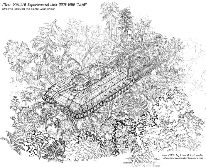 Named "Nike" by her Commander Major Stavrakas, the jungle camoflauge painted Unit NKE measured almost seventy-five meters from prow to stern, and thirty meters from the ground to the two back to back Hellbore turrets. Unit NKE was some 15 percent longer than the regular Mk XXIII, with an extra eleven meters of hull added forward of the VLS, (six or seven extra meters between infinite repeaters Three and Four). Nike had four separate tread systems, each having a separate power train, and five meter wide tracks. The interweaved bogie wheels were five meters in diameter, and the aft tracks had three extra bogies, when compared to a regular Bolo MK XXIII.